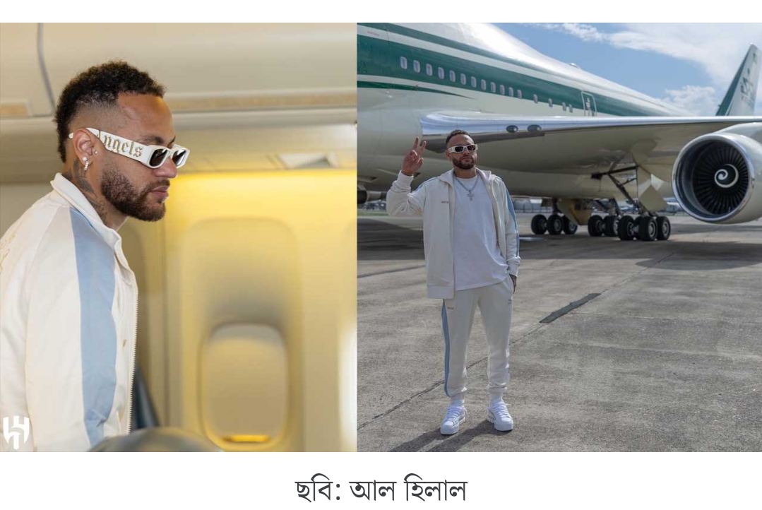 বার্তা সংস্থা রয়টার্সের দেওয়া ভিডিও ফুটেজে দেখা যায় গলায় যিশুর ক্রশসূচক হীরা খচিত চেন, সাদা ট্রাউজার্স ও টি-শার্ট পরা, কাঁধে ঝোলানো আল হিলালের স্কার্ফ পরে হেলে-দুলেই রিয়াদ এয়ারপোর্টের সদর দরজা পার করছিলেন ব্রাজিলিয়ান তারকা নেইমার। এরপর তাকে জানানো হয় ফুলেল শুভেচ্ছা।